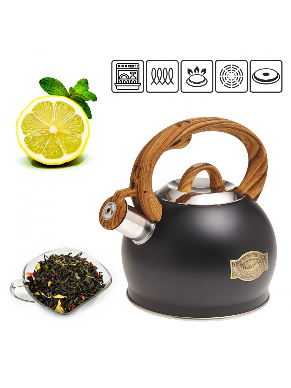 Чайник Kamille 2,0 л з нержавіючої сталі зі свистком і ручкою "soft touch" (чорний) виготовлений з високоякісних матеріалів з використанням новітніх технологій виробництва, завдяки чому він підходять для інтенсивного щоденного використання
