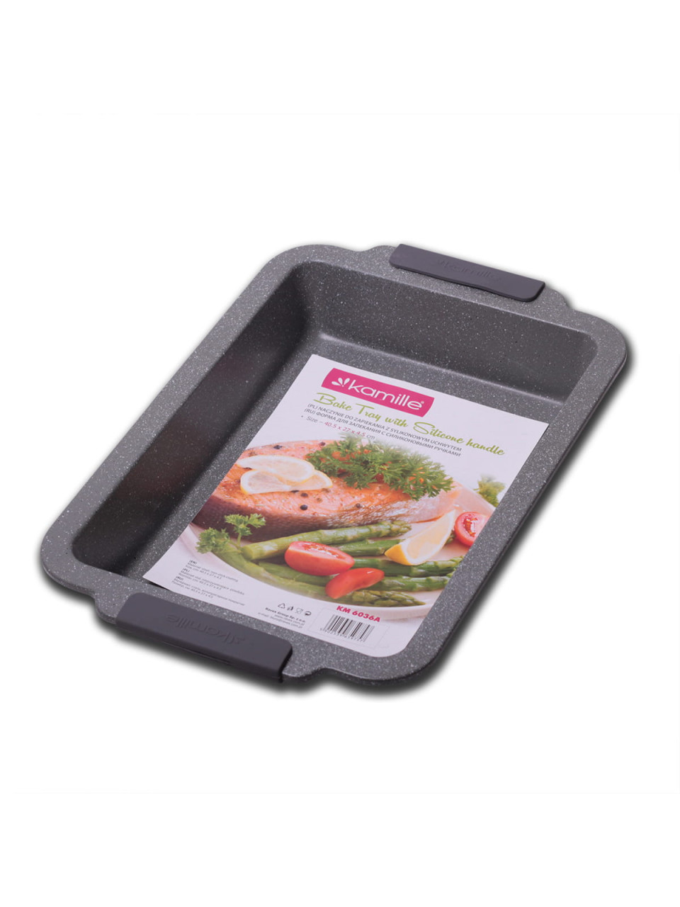 Форма для запікання Kamille – дуже зручна та практична, чудово підходить для використання в домашніх умовах, а також просто незамінна на професійній кухні. Форма виконана з вуглецевої сталі з антипригарним покриттям "мармур" і відрізняється своєю міцністю та зносостійкістю. У такій формі дуже зручно готувати різні запіканки та пироги, лазанню, овочеві, рибні чи м'ясні страви. Маючи у себе на кухні таку форму, Ви завжди зможете порадувати своїх рідних та близьких смачною та корисною їжею!
