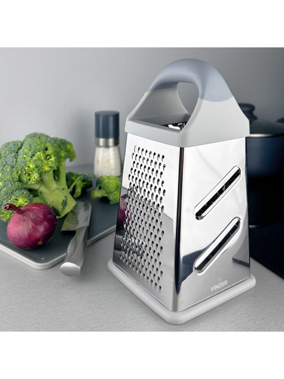 Багатофункціональна терка має чотири робочі боку з різними видами шинкування. Тертка виготовлена із нержавіючої сталі FERRINOX 18/10. Матеріал стійкий до корозії і деформації, впливу агресивних речовин. Ручка та основа терки прогумовані, тому вона зручна та безпечна у використанні.
