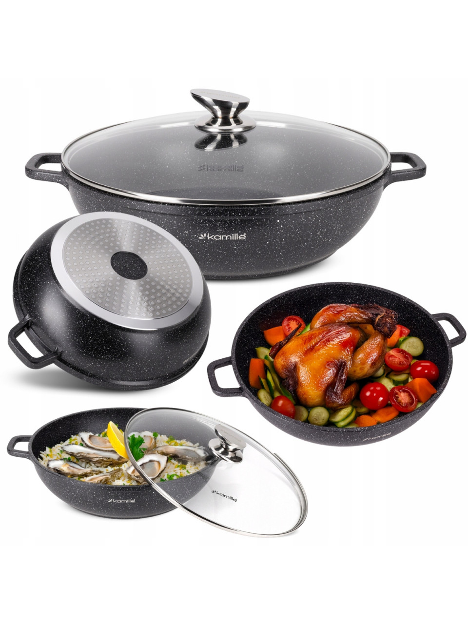 Виготовлена з литого алюмінію з антипригарним мармуровим покриттям, кришка виготовлена з термостійкого скла. Ємність: 5,5 л. Діаметр: 32 см. Висота без чохла: 8,5см. Дно відмінно підійде для накопичення і рівномірного розподілу тепла. Підходить для всіх типів печей, включаючи духовку.