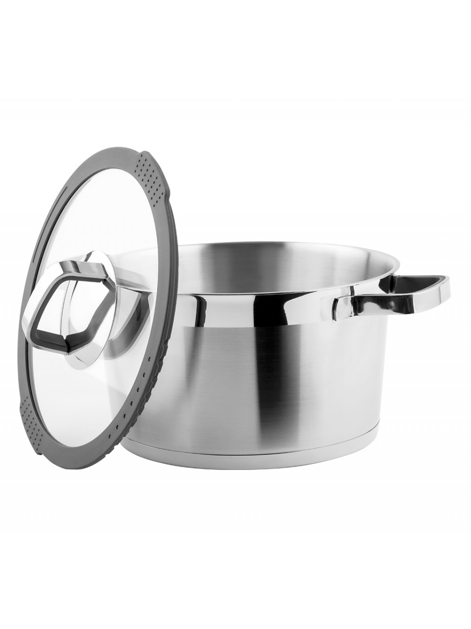 Універсальна каструля виготовлена із нержавіючої харчової сталі FERRINOX 18/10. Формула 18/10 свідчить про вміст 18% нікелю та 10% хрому. Сталь не містить штучних компонентів, стійка до деформації та впливу агресивних речовин. Зручний носик для зливу води зробить їжу простим і зручним. Дно виготовлене за технологією Impact Bonding, тришарове, капсульне, добре утримує тепло. На внутрішній стінці нанесена мірна шкала. Комбінована кришка з термостійкого скла та силікону. Містить отвір для випуску пари, а також отвори різного розміру, які розташовані з обох боків обідка кришки, для зливу води. Ручки виконані з високоякісної нержавіючої сталі FERRINOX 18/10 із силіконовими вставками. Кріплення ручок до стін виконано точковою пайкою.