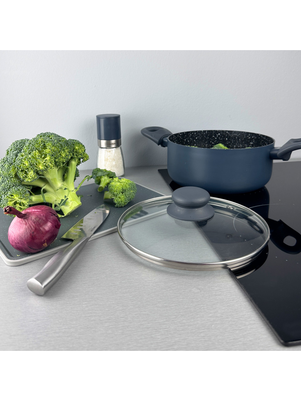 Каструля має тришарове антипригарне покриття товщиною 30 мікрон з додаванням гранітної крихти, яке має високий ступінь твердості, високий рівень стійкості до подряпин і зносостійкості. Сталевий індукційний антидеформаційний диск на дні прискорює розподіл тепла, посилює стійкість дна до деформації та уможливлює використання посуду на індукційних плитах. Бакелітові ручки каструлі Vinzer Stone Induction Line з покриттям SOFT TOUCH не нагріваються під час приготування і дуже приємні на дотик.