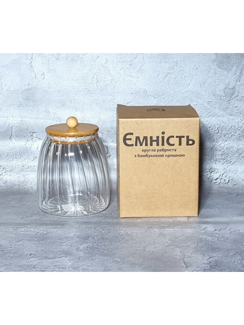 Ємність скляна S&T 1000 мл кругла ребриста з бамбуковою кришкою