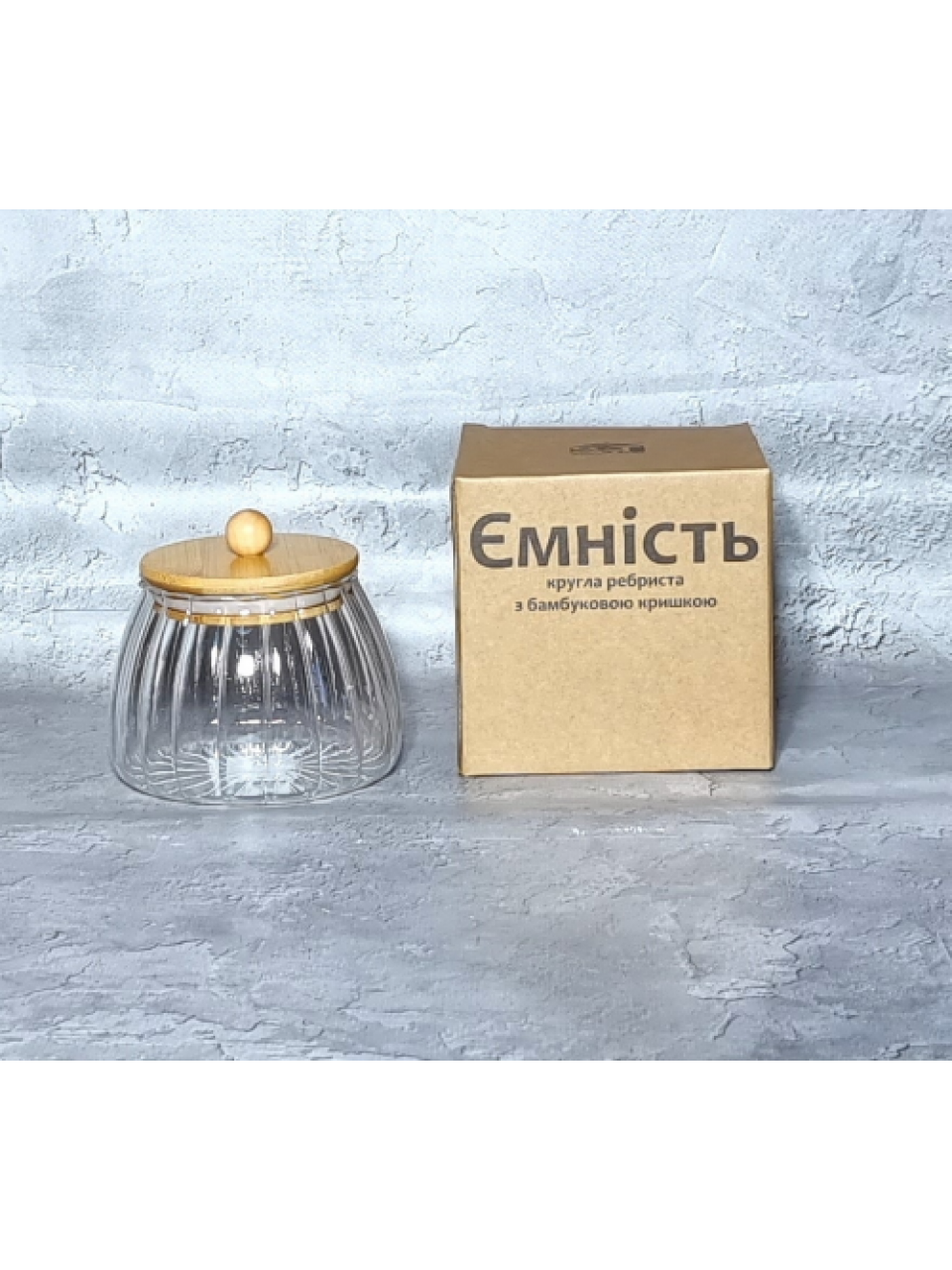 Ємність скляна S&T 600 мл кругла ребриста з бамбуковою кришкою