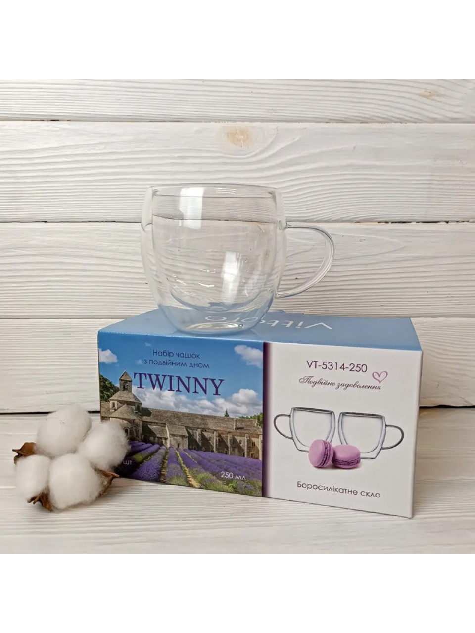 Набір чашок VT-5314-250 TWINNY з подвійним дном 2шт. 250мл Vittora - набір складається з двох чашок об'ємом 250 мл кожна. Чашки виготовлені з високоякісного термостійкого скла, яке здатне витримувати значні температурні різниці без ризику розбиття. Подвійне дно забезпечує додаткову ізоляцію, що дозволяє напою довше залишатися гарячим або холодним. Ці чашки можна використовувати для чаю, кави, гарячого шоколаду та будь-яких інших напоїв за вашим смаком. Вони також можуть бути використані для подачі холодних напоїв, таких як лимонад або морс. Якщо ви шукаєте стильний і функціональний набір чашок для свого будинку або як подарунок для близької людини, то цей набір із термостійкого скла з подвійним дном буде чудовим вибором.