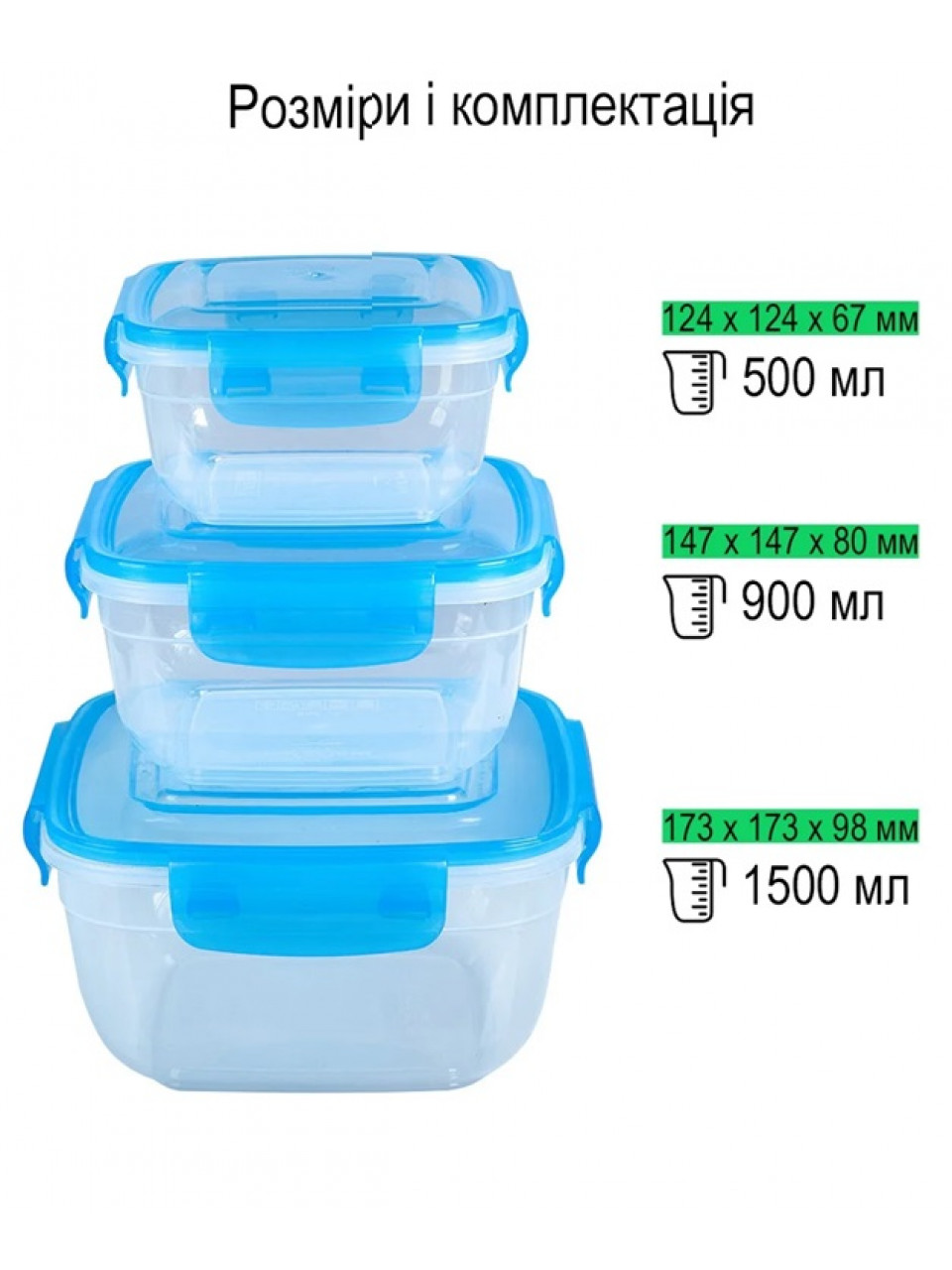 Набір герметичних квадратних контейнерів Stars Plast з кольоровою кришкою 3 шт (500,900, 1500 мл)