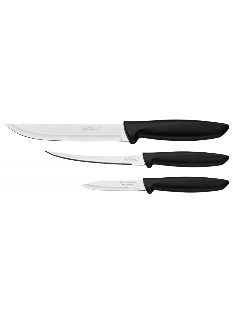 Набір ножів Tramontina Plenus з чорною рукояттю, 3 предмети (23498/013) - комплект найнеобхідніших ножів на кухні. З їх допомогою Ви зможете і салат з самих стиглих помідорів зробити, і очистити овочі для рагу, борщу або іншої першої страви, а також ніж для м'яса з лезом особливої форми. Завдяки якому обробляти м'ясо просто та швидко.