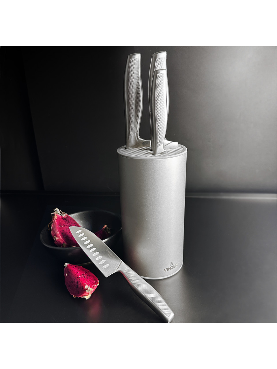 Практичний та компактний набір ножів – відмінне рішення для повсякденного використання. Леза виконані з високовуглецевої сталі, стійкої до деформації та зберігаючої бездоганний зовнішній вигляд. Завдяки клиноподібній формі ріжучої кромки ножі надовго зберігають гостроту і практично не потребують заточування. Ергономічні рукоятки зручно лежать у руці і не ковзають у процесі роботи. Стильна підставка із нержавіючої сталі зі структурним покриттям надійно утримує ножі та гармонійно вписується в інтер’єр кухні.