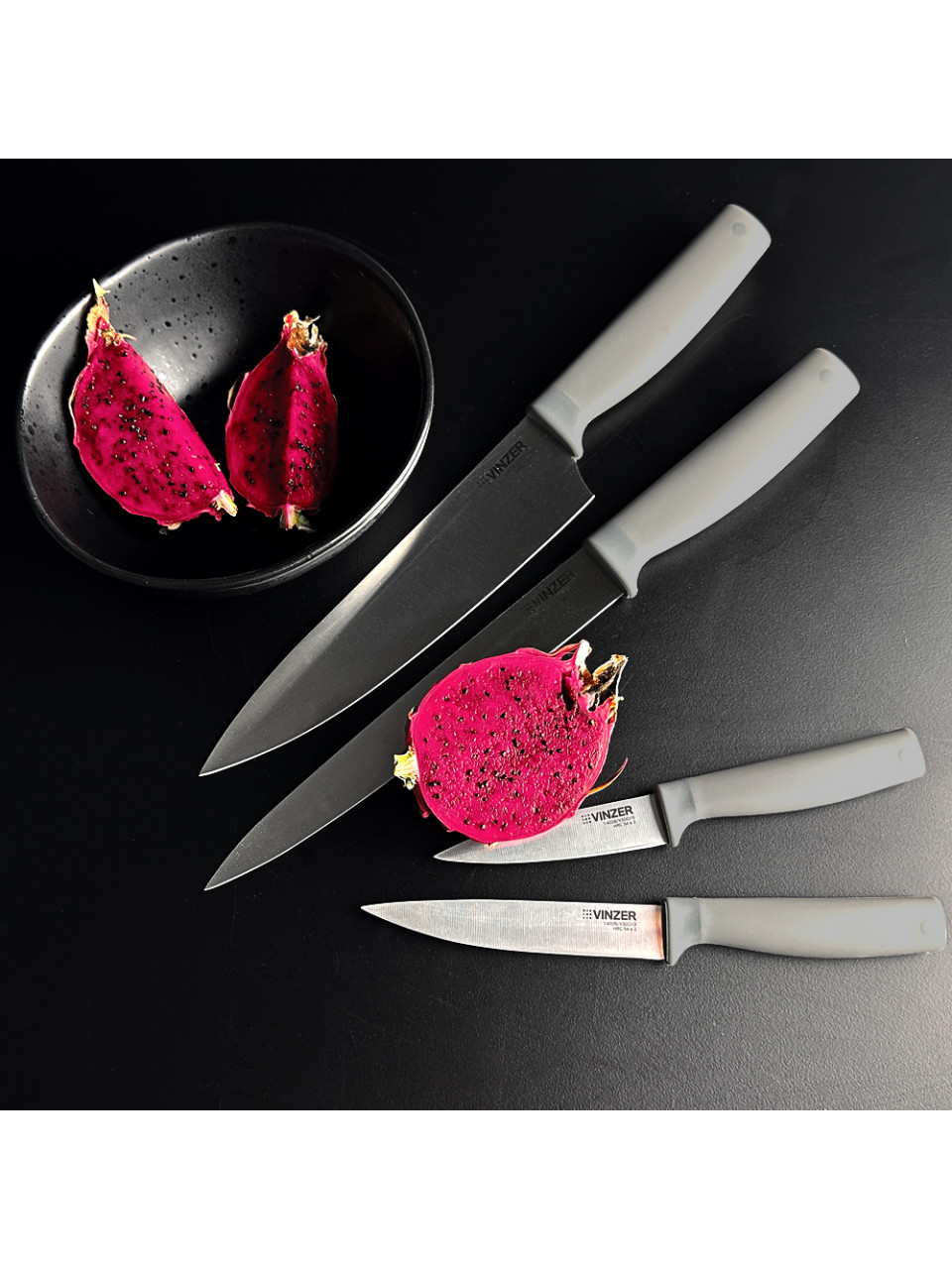Набір універсальних ножів складається із чотирьох популярних ножів. Ножі виготовлені з високовуглецевої нержавіючої сталі, стійкої до механічних пошкоджень, корозії та деформації. Лезо довгий час зберігає гостроту завдяки клиноподібному перетину. Пластикова ручка добре лягає в руку, не ковзає під час використання.