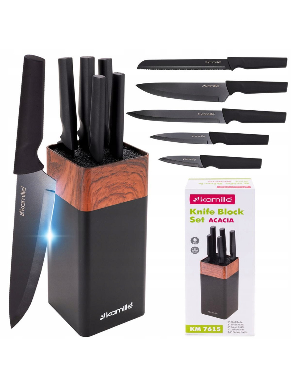 Набор ножів Kamille Acacia Black з 5 кухонних ножів + підставка чорний квадрат