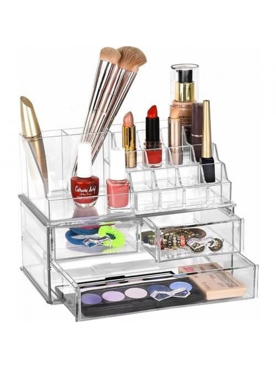 Органайзер має 3 висувні ящики, 2 менші та 12 осередків для вертикального зберігання, забезпечуючи легкий доступ до кожної секції. Висота виробу 18,0 см, розміри: 13,5 * 23,0 см. Органайзер виготовлений із пластику, який безпечний для здоров'я людини та має високу зносостійкість і не вимагає особливого догляду. Його прозорі стіни дозволяють бачити вміст.