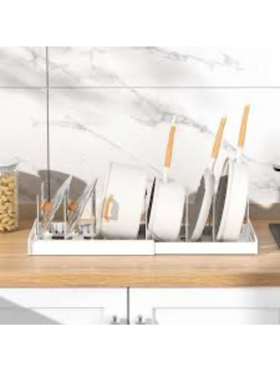 Функціональність, практичність і економія місця – це органайзер для посуду. Він ідеально підходить для зберігання різних форм, кришок і навіть сковорідок. Організатор допомагає позбутися хаосу, пов’язаного зі зберіганням посуду різного розміру, завдяки регульованій стійці. Включає 7 не дряпаються регульованих роздільників з прорізами для ручки сковороди.