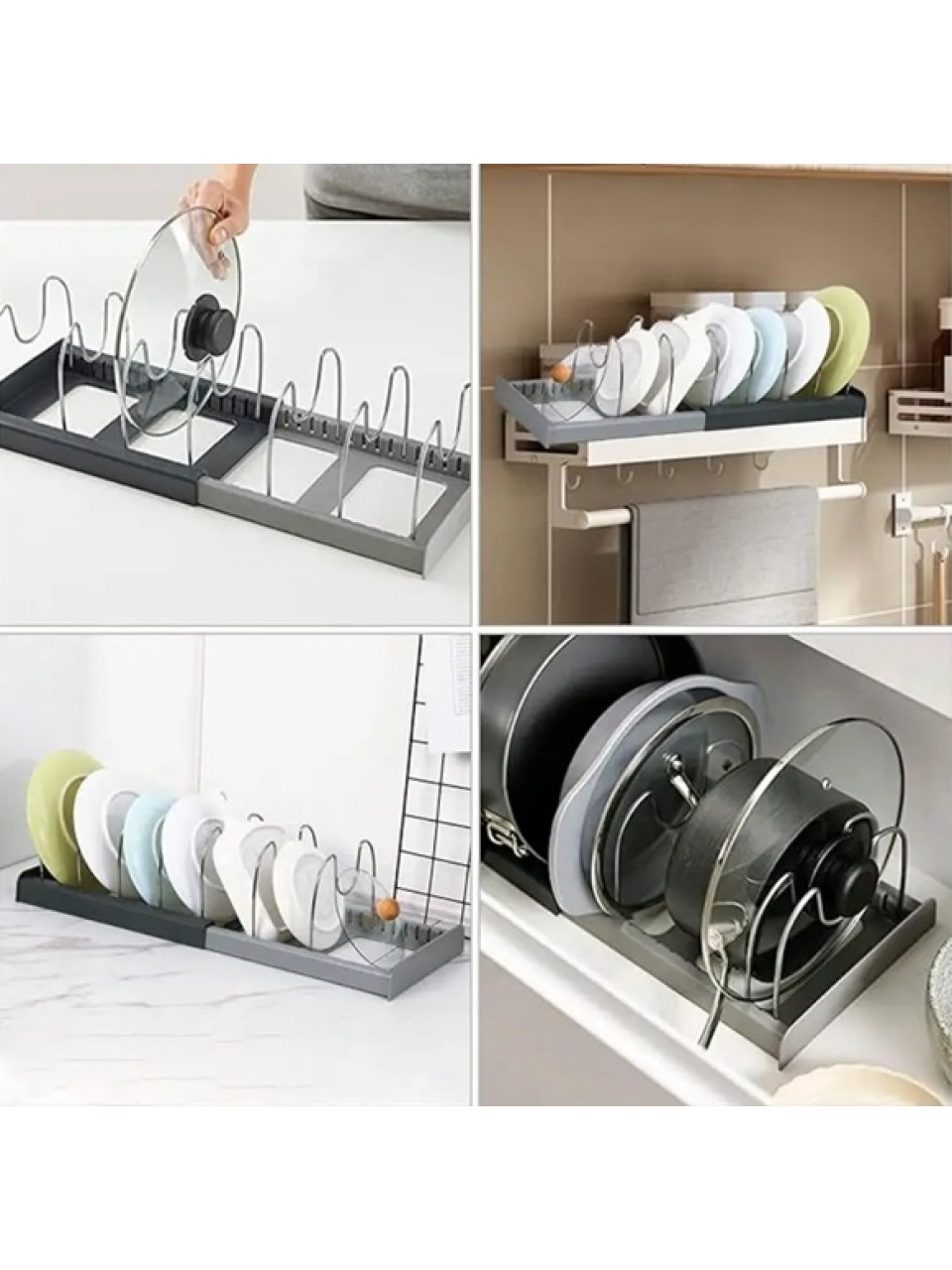 Функціональність, практичність і економія місця – це органайзер для посуду. Він ідеально підходить для зберігання різних форм, кришок і навіть сковорідок. Організатор допомагає позбутися хаосу, пов’язаного зі зберіганням посуду різного розміру, завдяки регульованій стійці. Включає 7 не дряпаються регульованих роздільників з прорізами для ручки сковороди.