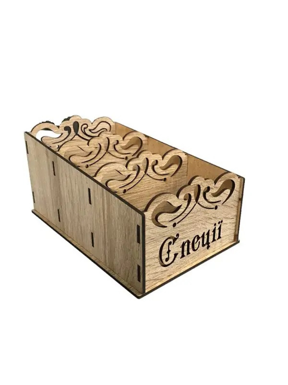 Виготовлений із ламінованої фанери з різьбленими елементами. Має три відділення для зберігання приправ