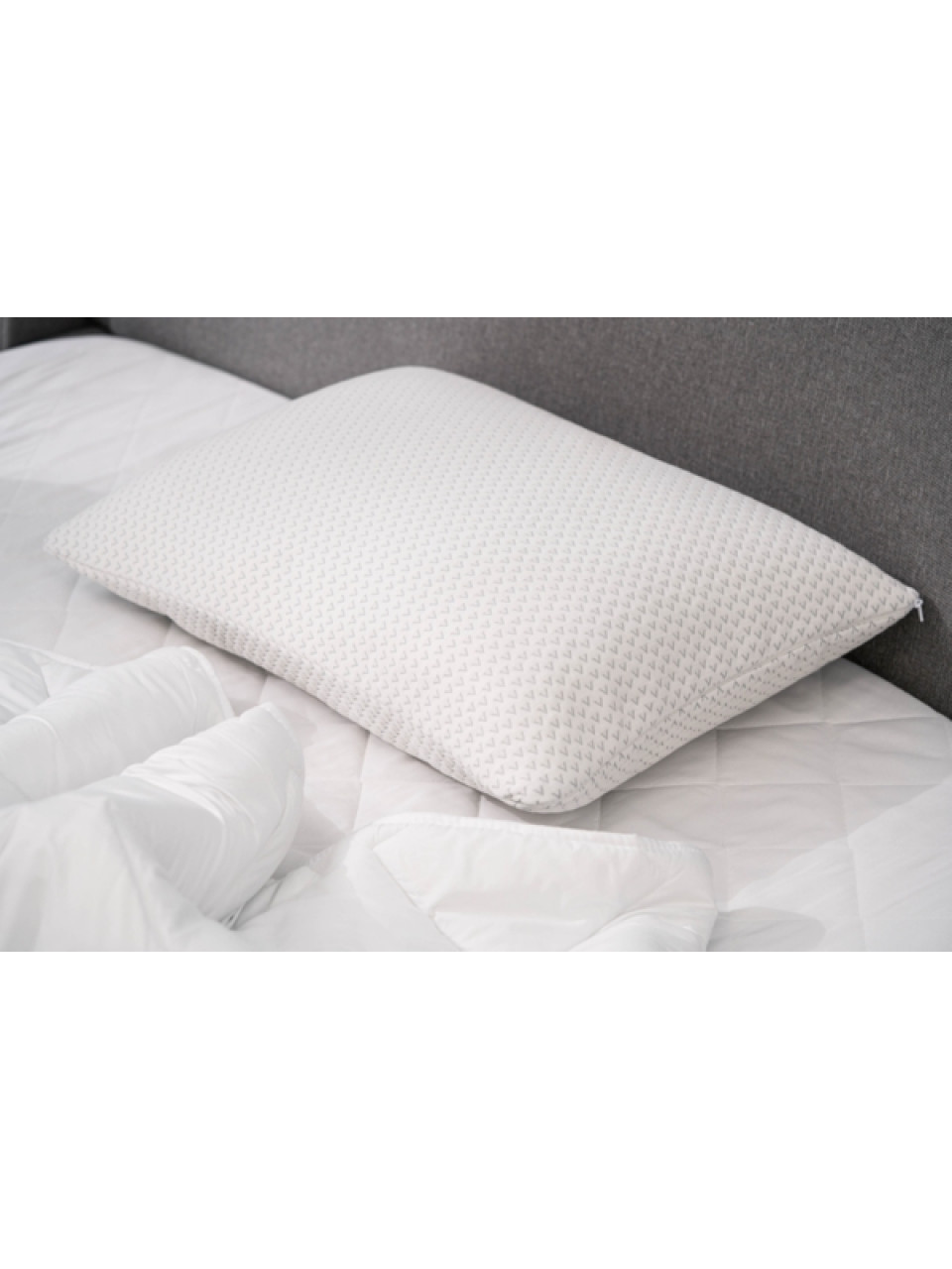 Зовнішній чохол виготовлений із жакардової тканини (63% поліестер, 22% віскоза, 15% бамбукове волокно), має застібку-блискавку та вирізняється протибактеріальними властивостями, забезпечуючи гігієнічність і свіжість. Внутрішній чохол із трикотажного поліестеру захищає наповнювач від пилу та забруднень і допомагає зберегти його первинну форму. Рекомендований розмір наволочки – 50х70 см.