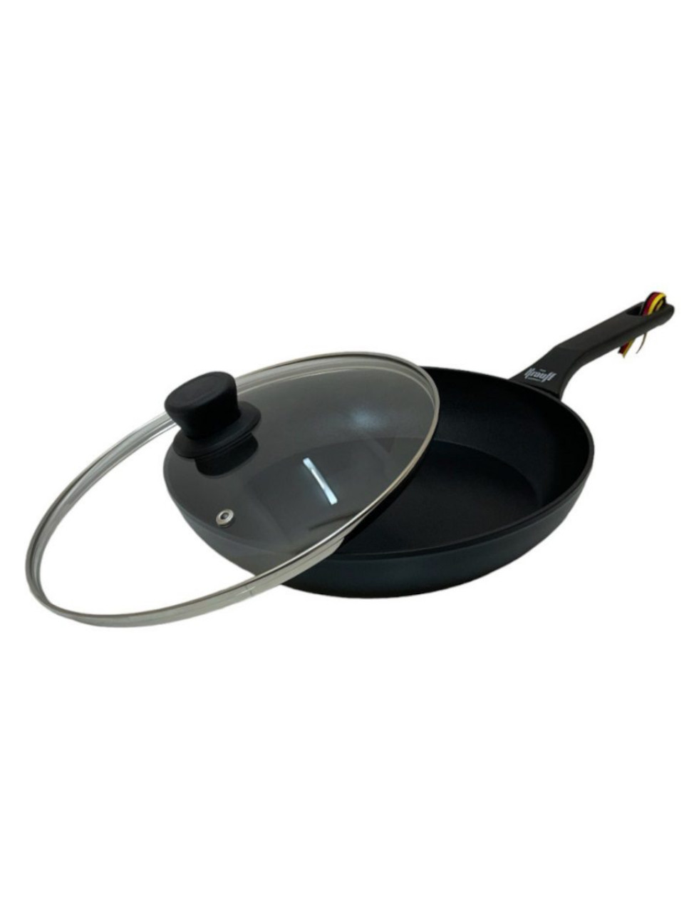 Алюмінієва сковорідка зі скляною кришкою (26 см) від німецького виробника Krauff призначена для повсякденної роботи, підходить для інтенсивного використання і зберігає чудовий зовнішній вигляд упродовж усього терміну експлуатації. Оснащена новітнім антипригарним покриттям GreblonC3. Покриття складається з чотирьох шарів: сітки з карбіду вольфраму - для забезпечення рівномірного розподілу тепла всією поверхнею сковорідки, базового антикорозійного покриття, основного полімерного шару, армованого керамічними частками і захисного шару. Оптимальна товщина стінок захищає посуд від деформації. Особливості та переваги: виготовлена з кованого високоякісного алюмінію; оснащена антипригарним покриттям GreblonC3; стійка до впливів температур і деформацій; товсте багатошарове дно забезпечує рівномірний розподіл тепла в процесі приготування їжі; бакелітова ручка на гвинтовому кріпленні з soft-touch покриттям; кришка із загартованого термостійкого скла; можна використовувати на всіх типах плит, включно з індукційними.