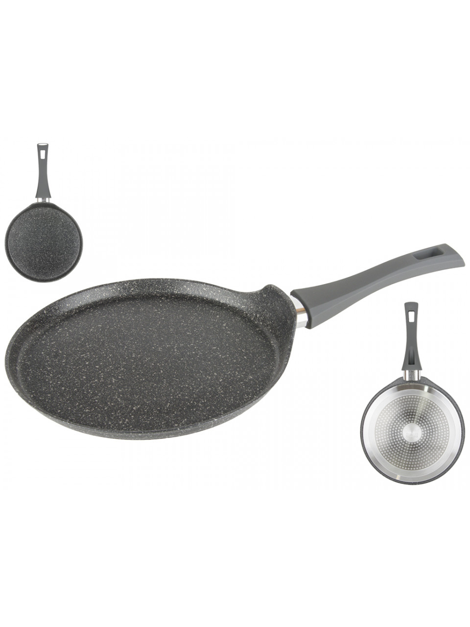 Тип сковороди: млинцева. Форма: кругла. Діаметр: 26см. Висота: 2см. Довжина ручки: 19см. Матеріал: алюміній. Матеріал ручки: пластмаса з покриттям "soft-touch". Антипригарне покриття: Marble. Тип плити: електрична, склокерамічна, газова, галогенова, індукційна. Підходить для миття в посудомийній машині.