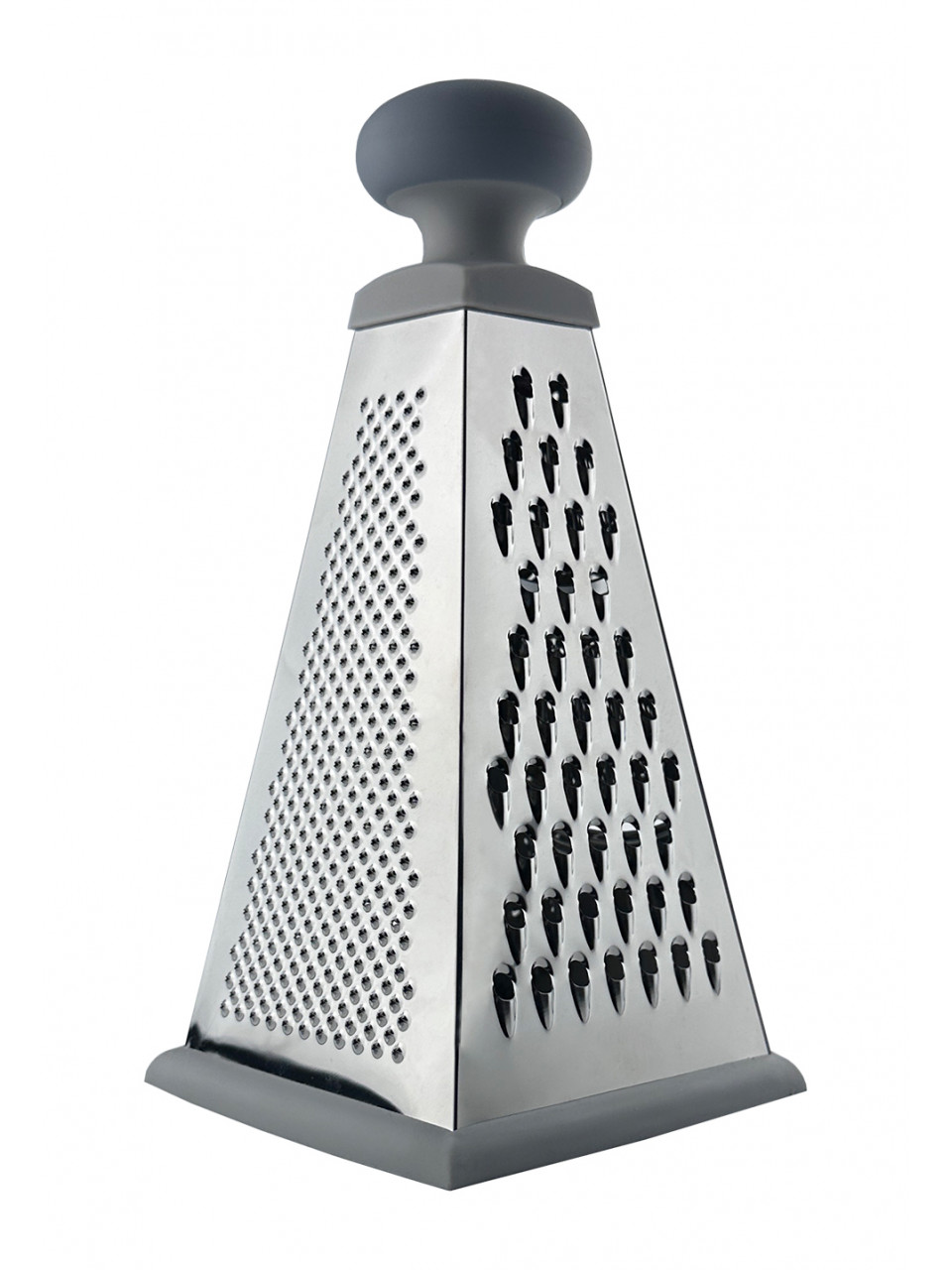 Багатофункціональна терка має чотири робочі боку з різними видами шинкування. Тертка виготовлена із харчової нержавіючої сталі FERRINOX 18/10. Матеріал стійкий до корозії і деформації, впливу агресивних речовин. Ручка і нижня частина терки прогумовані, тому вона безпечна і зручна у використанні.