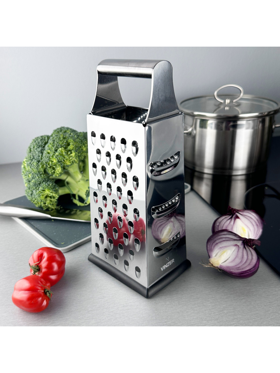 Зручна і проста у використанні терка з чотирма різними робочими поверхнями стане незамінним аксесуаром на будь-якій кухні. Терка виготовлена з високоміцної харчової сталі FERRINOX 18/10, яка не деформується з часом, не піддається впливу кислот і лугів, а також корозії. Робочі поверхні виготовлені способом двостороннього хімічного травлення, що забезпечує бритвену гостроту лезам. Нижня частина терки прогумована, що робить її зручною під час роботи.