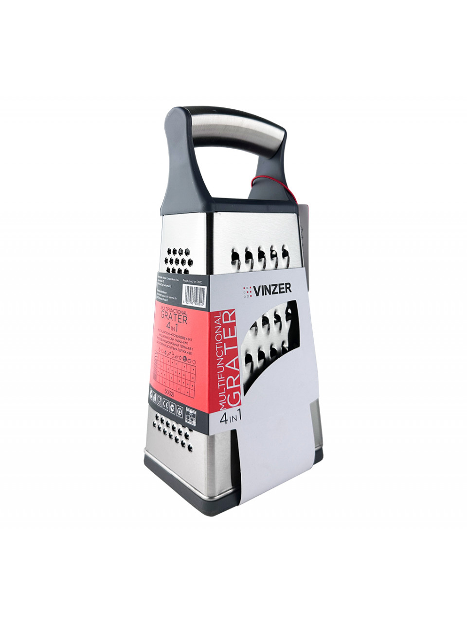 Чотиристороння терка з піддоном дозволить швидко і акуратно подрібнити продукти. Терка виготовлена з високоякісної харчової сталі FERRINOX 18/10, яка не деформується з часом, стійка до деформації і корозії. Робочі поверхні виготовлені методом електрохімічного травлення, що забезпечує максимальну гостроту. Внутрішня частина гладка, тому легко очищається і не накопичує залишки продуктів. Ручка прогумована, не ковзає під час роботи і робить тертку стійкою. Чотири різновиди терки: дрібна, середня, велика і для шинкування.