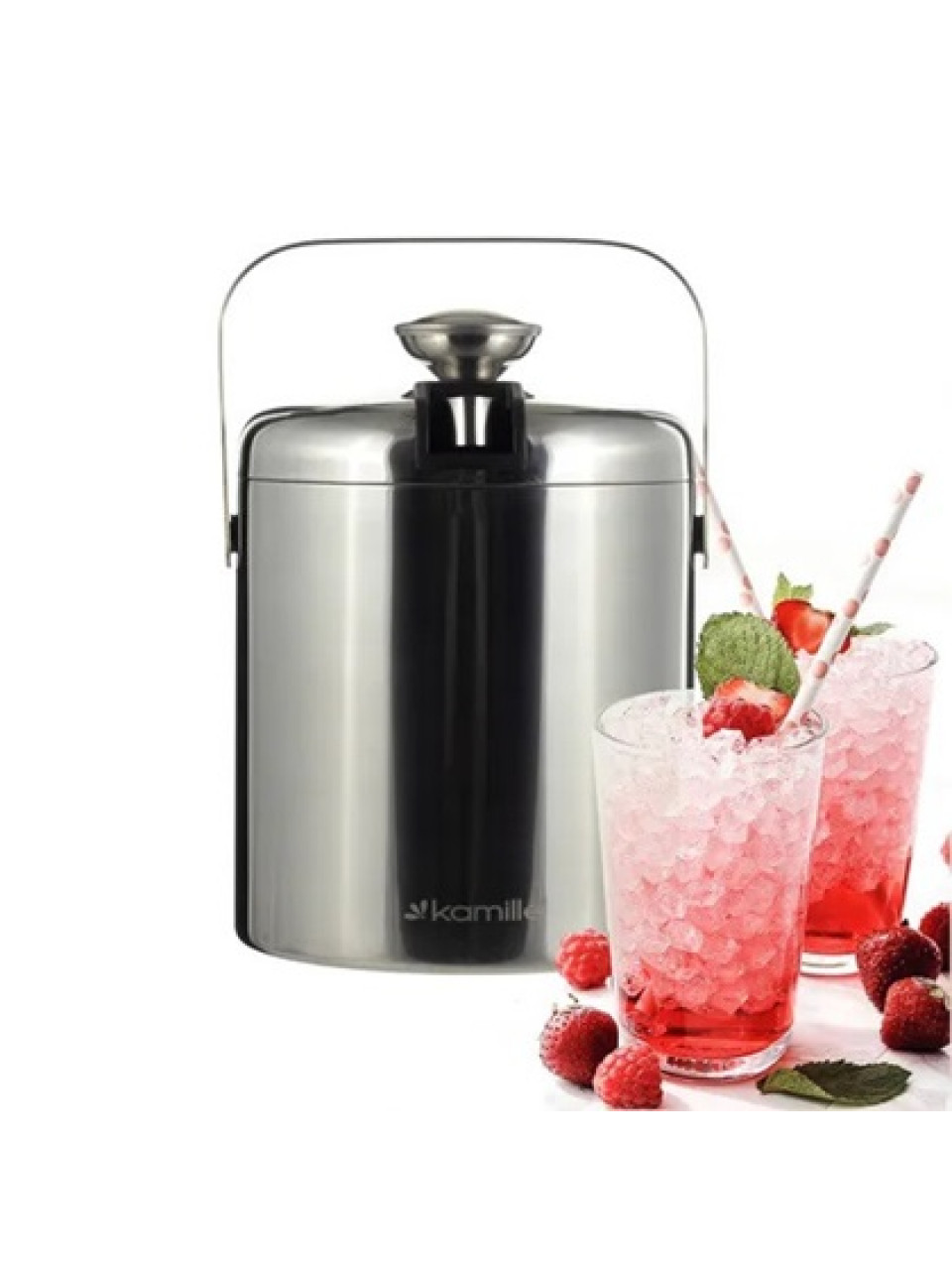 Відро для льоду Kamille виконане з міцної нержавіючої сталі, має стильний мінімальний дизайн, тому відмінно доповнить будь-яке сервірування. Ергономічна ручка-дужка дозволить зручно тримати в одній руці. У комплект входять спеціальні щипці для льоду, піддон з отворами щоб вода з льоду, що розтанула, стікала на дно. Конструкція з подвійними термоізоляційними стінками дозволяє льоду довше залишатися таким, що не розтанув. Предмет та комплектуючі можна мити в посудомийній машині.