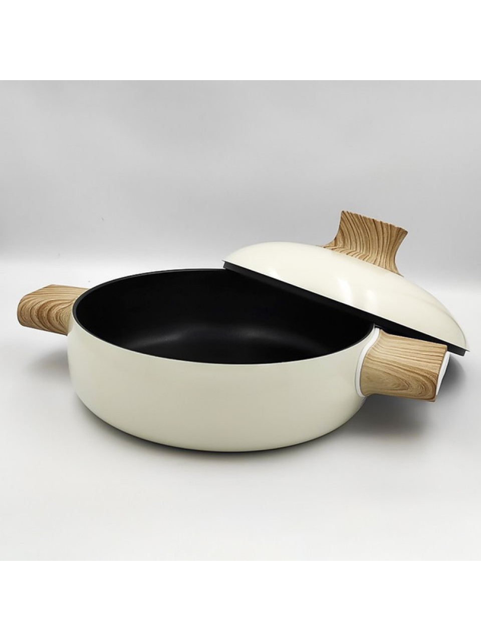 Жарівня PR-2330-22 Біла перлина 22см. 2л. PEPPER - виготовлена з високоякісного штампованого алюмінію толщиною 3 мм, що забезпечує швидке та рівномірне нагрівання. Крім того, вона має 3-кульове внутрішнє покриття Pfluon чорного кольору, яке забезпечує антипригарні властивості та стійкість до царапин. Ручка каструлі виконана з бакеліту з силіконовими вставками та ефектом soft touch кольору молочного дуба, що забезпечує зручне та безпечне захоплення каструлі під час приготування. Низ: повна індукція+лазерний логотип. Запакована у фірмову коробку.